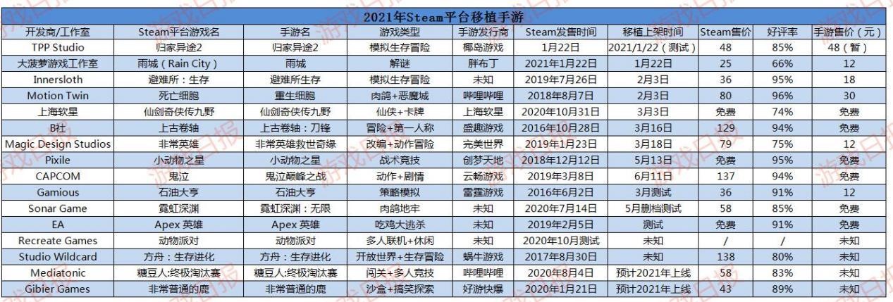 在2021年第一季度中,Steam平台有哪些游戏进行了移植,表现又如何呢?对此,游戏日报小宝对今年上线的超1000款手游进行了回顾,汇总得到16款从Steam平台移植的手游。