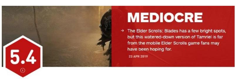 目前16款移植游戏,已有6款游戏正式上架移动端,4款游戏处于测试阶段,2款游戏计划今年内上架。在已上架的6款游戏中,3款游戏来自国内厂商制作,分别是:《非常英雄》,《雨城》,《仙剑奇侠传九野》。其中由完美世界代理的《非常英雄救世奇缘》和哔哩哔哩代理的《重生细胞》均获得过iOS总榜最高排名第一。另2款国产游戏中,《雨城》获iOS总榜最高排名第26名,《仙剑奇侠传九野》iOS总榜最高排名第67位。需要注意的是,在4月《仙剑奇侠传九野》已由iOS总榜第253位掉到了1461位。据玩家反馈,造成其排名波动较大的主要原因还是卡牌的平衡存在争议及服务器问题上。在同一时间段内,Steam平台也有不少玩家留言表示和移动端存在类似的问题。《上古卷轴》IP手游玩家评分2.6分,iOS免费榜跌至1230名 和国产游戏表现亮眼不同,游戏日报小宝关注到,由国内盛趣代理的经典IP《上古卷轴》在移动端表现并不算太好。首先是国外媒体打分普遍偏低,其中IGN为5.4分。玩家评分仅2.6分。