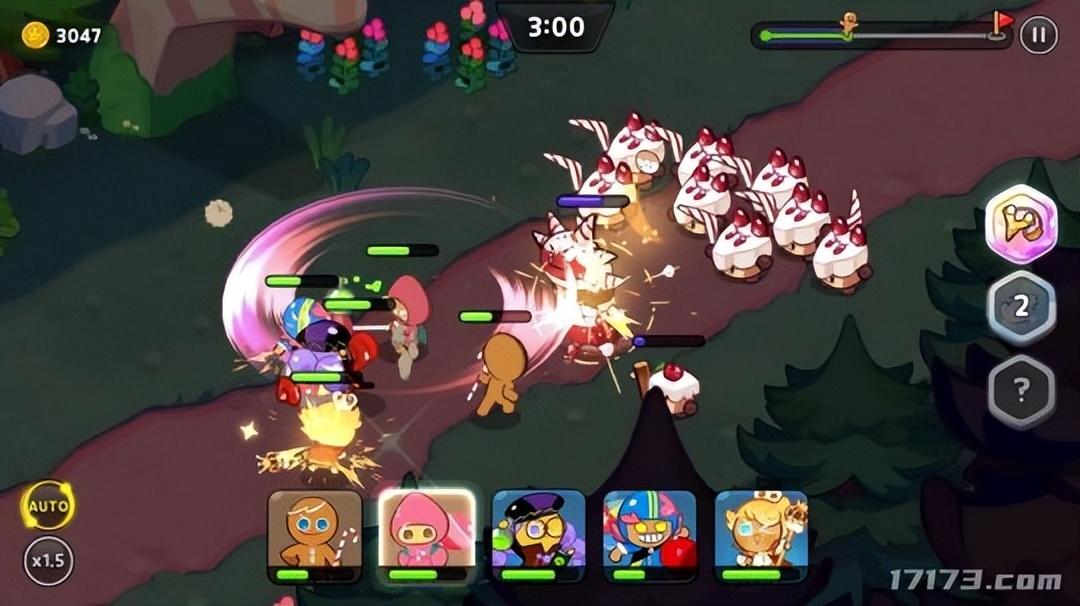《冲呀!饼干人:王国》的战斗系统比较简单,PVE中一个关卡可以放置五个饼干人,分为前中后排,队形可以自行调整。游戏中除了饼干人的技能之外,还有着自行装备的三个宝物可供使用,如果感觉眼花缭乱按不过来,自动战斗就完事了。而追求极致的大佬们也可以全程手动战斗,来挑战越级打怪。