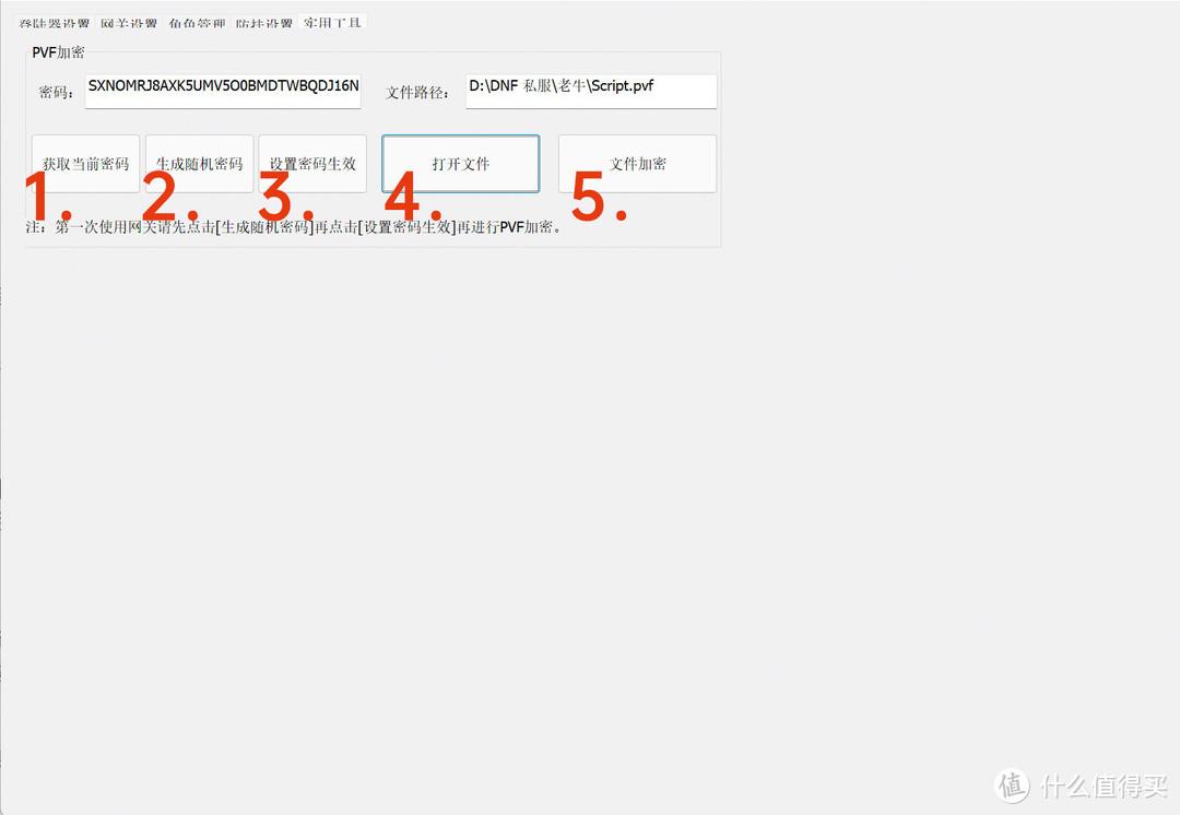 再点击最后一页,依次“获取当前密码→生成随机密码→应用当前密码”,再点击打开文件,把解压文件里面的 Script.pvf 文件选上,然后点击应用,得到一个新的 Script.pvf 文件,把这个文件放回 DNF 台服客户端内即可。