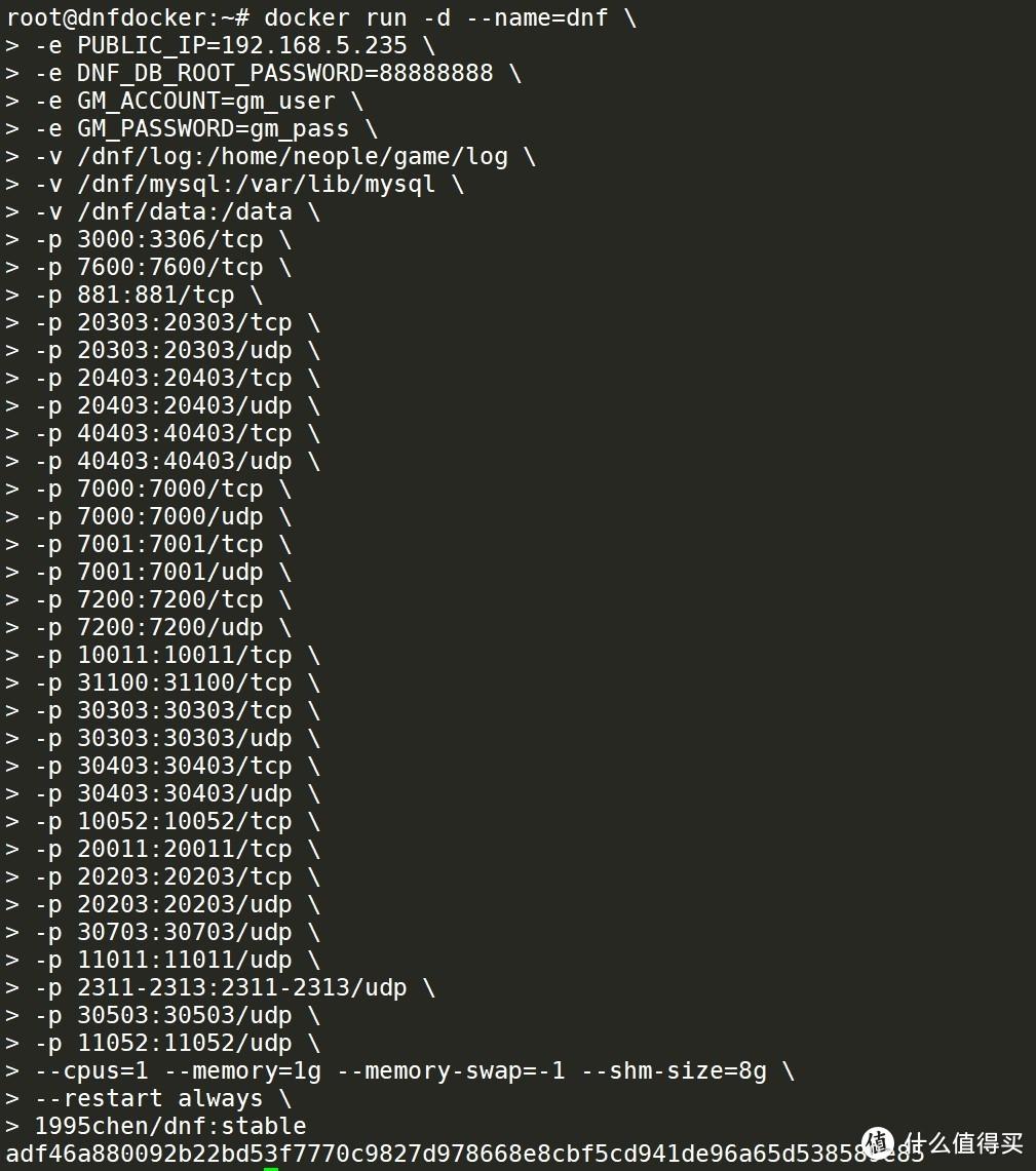 docker run -d --name=dnf -e PUBLIC_IP=192.168.5.235 -e DNF_DB_ROOT_PASSWORD=88888888 -e GM_ACCOUNT=gm_user -e GM_PASSWORD=gm_pass -v /dnf/log:/home/neople/game/log -v /dnf/mysql:/var/lib/mysql -v /dnf/data:/data -p 3000:3306/tcp -p 7600:7600/tcp -p 881:881/tcp -p 20303:20303/tcp -p 20303:20303/udp -p 20403:20403/tcp -p 20403:20403/udp -p 40403:40403/tcp -p 40403:40403/udp -p 7000:7000/tcp -p 7000:7000/udp -p 7001:7001/tcp -p 7001:7001/udp -p 7200:7200/tcp -p 7200:7200/udp -p 10011:10011/tcp -p 31100:31100/tcp -p 30303:30303/tcp -p 30303:30303/udp -p 30403:30403/tcp -p 30403:30403/udp -p 10052:10052/tcp -p 20011:20011/tcp -p 20203:20203/tcp -p 20203:20203/udp -p 30703:30703/udp -p 11011:11011/udp -p 2311-2313:2311-2313/udp -p 30503:30503/udp -p 11052:11052/udp --cpus=1 --memory=1g --memory-swap=-1 --shm-size=8g --restart always 1995chen/dnf:stable