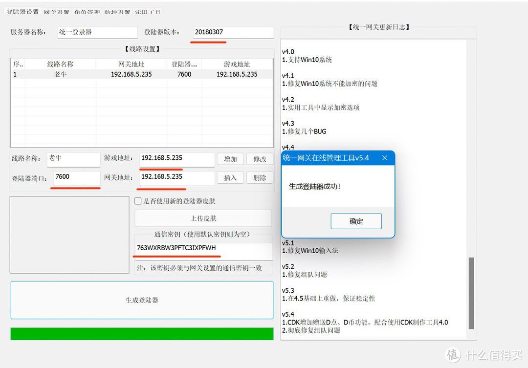 通讯密钥: 763WXRBW3PFTC3IXPFWH登录器端口: 7600网关端口:881GM账户: gm_userGM密码: gm_pass登陆器版本:20180307如果没有返回错误信息就代表连接网关成功,接下来就是生成启动器。