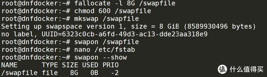 因为这个 DNF 台服容器非常消耗内存,作者推荐设置 8G SWAP 虚拟内存,所以我们这就来设置一下。如果你的机器已经大于 8G 内存,可以跳过这一步。