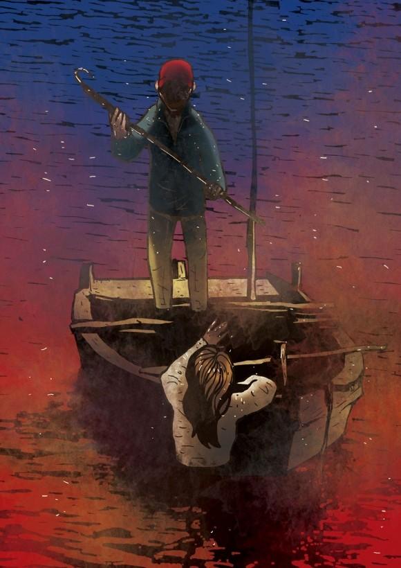 吴钟根搭载这对夫妇,是因为第一眼看到夫妇中的妻子,心中产生了无法抑制的邪念。夫妇两人站在船头的箱子上,望着大海欣赏风景,浑然不觉已经到来的危险。到了海中央,吴钟根停下了船,决定实施他的阴险意图。首先,他悄悄接近男子趁其不备将他推入海中在,在男子挣扎着想回到船上过程中,吴钟根举起一根一端带有铁钩的杆子,阻挡并击打男子,最终导致男子溺亡。