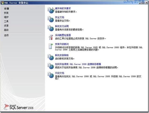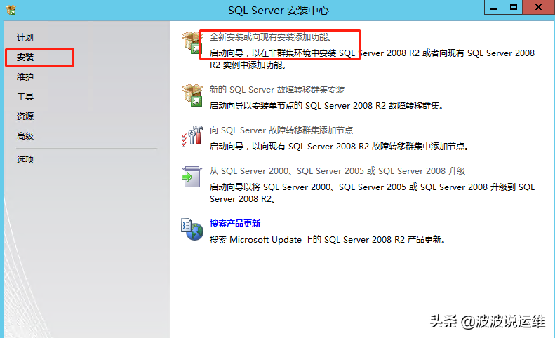 运行下发的SQL_08_R2_CHS安装盘中的【setup.exe】,在弹出的窗口上选择“安装”,在安装页面的右侧选择“全新安装或向现有安装添加新功能”