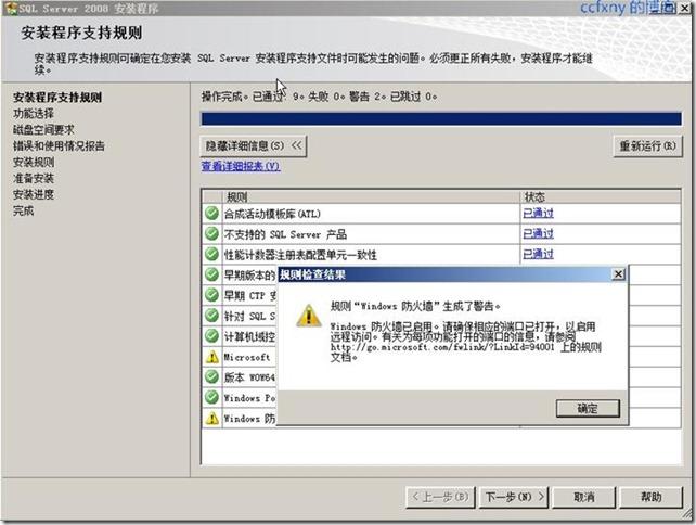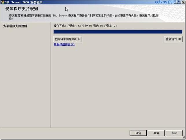 弹出安装程序支持规则,检测安装是否能顺利进行,通过就点击确定,否则可点击重新运行来检查。