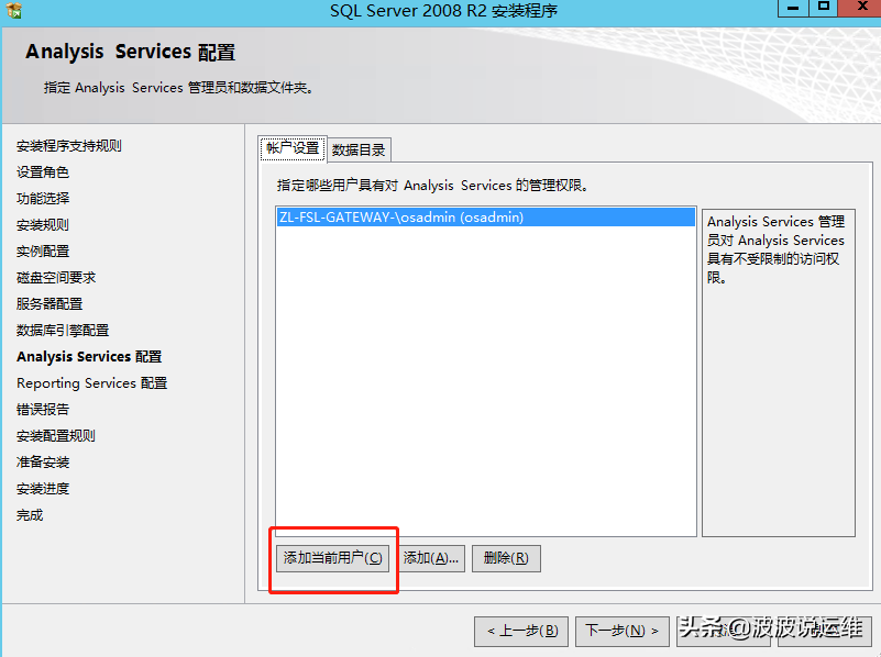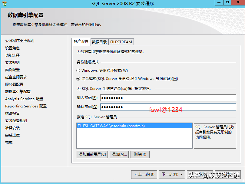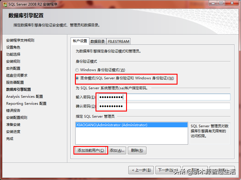 点击下一步,弹出【数据库引擎配置】对话框,选择【混合模式】,输入用户名和密码,添加【当前用户】。