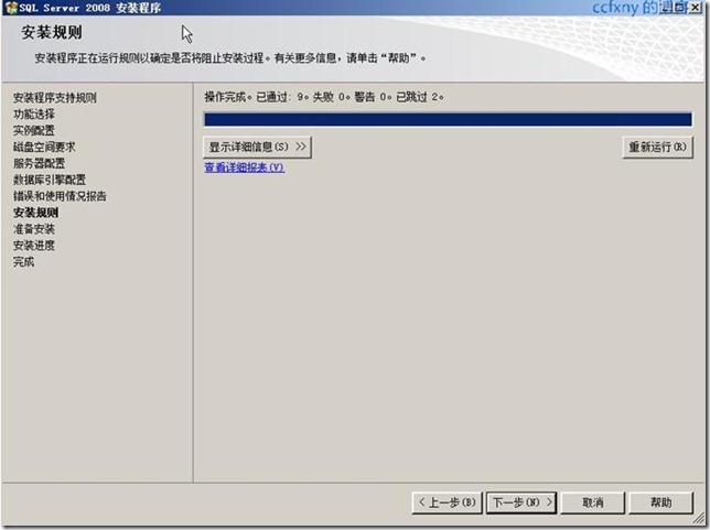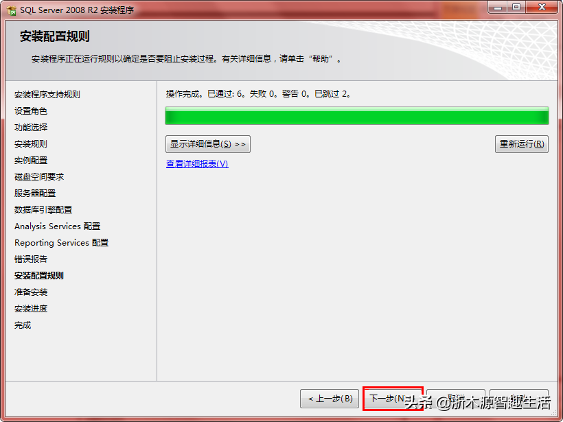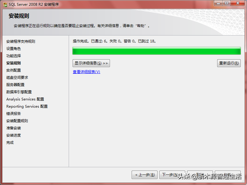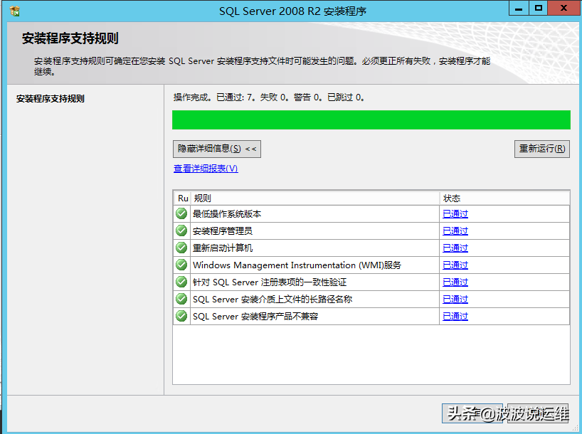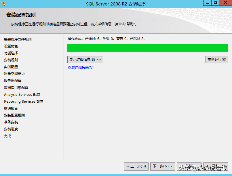 点击下一步弹出【安装程序支持规则对话框】,安装程序支持规则可确定在您安装SQL Server安装程序文件时可能发生的问题。必须更正所有失败,安装程序才能继续。确认通过点击下一步。