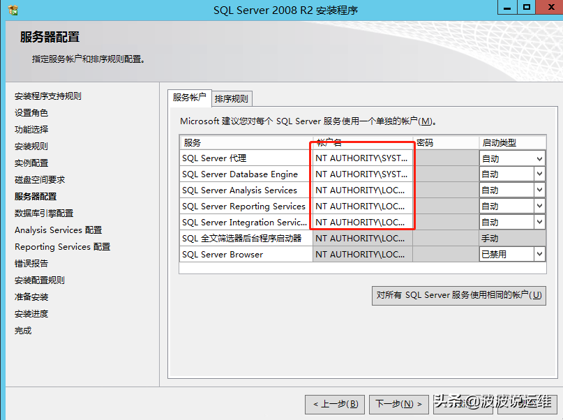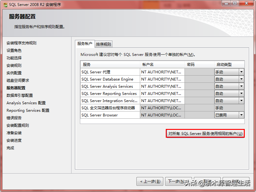点击下一步,弹出【服务器配置】对话框,指定服务账户和排序规则配置,页面中点击【对所有SQL Server服务使用相同的账户】
