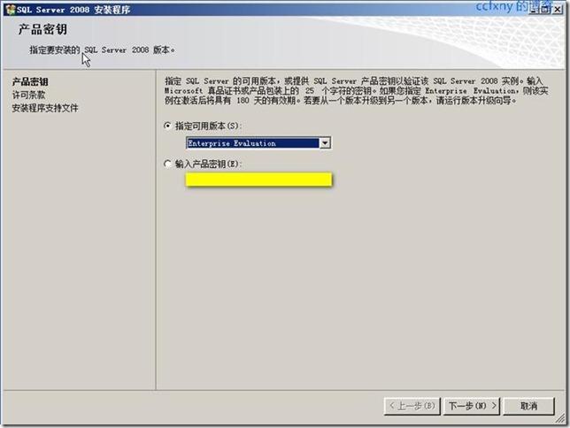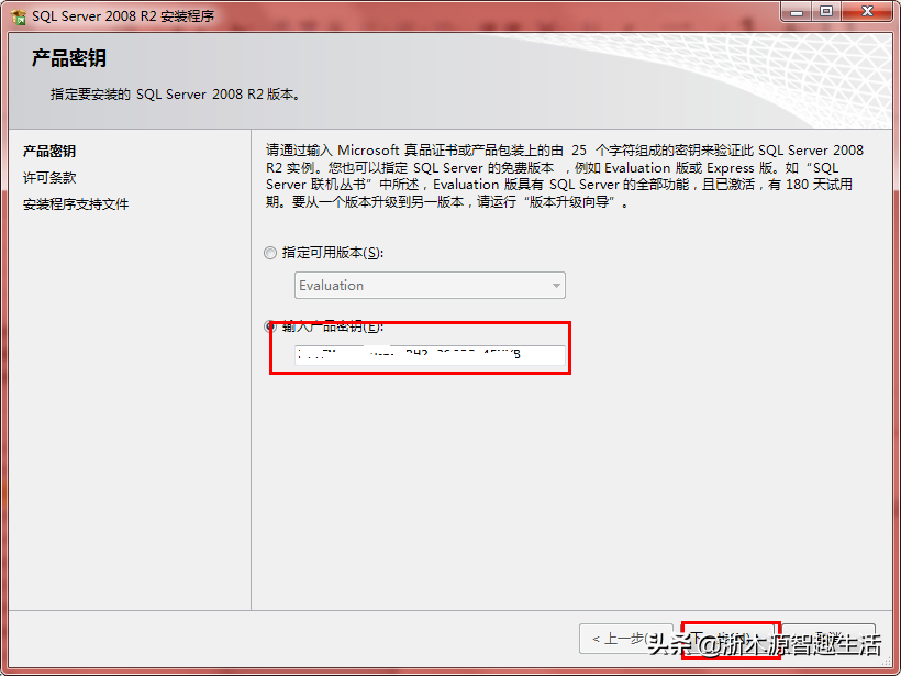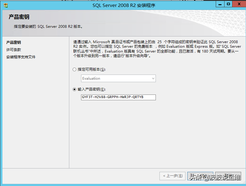 在弹出的【产品密钥】对话框中选择【输入产品密钥】选项,并输入SQL Server 2008 R2安装光盘的产品密钥,点击下一步。