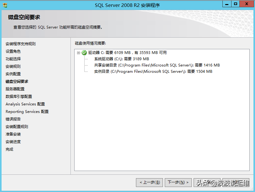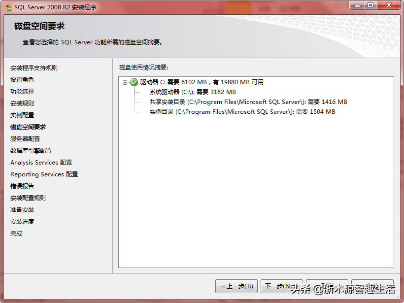 点击下一步弹出【磁盘空间要求】对话框,可以查看您选择的SQL Server功能所需的磁盘摘要。