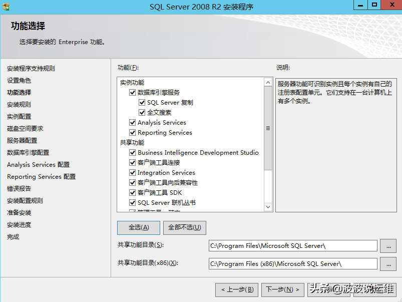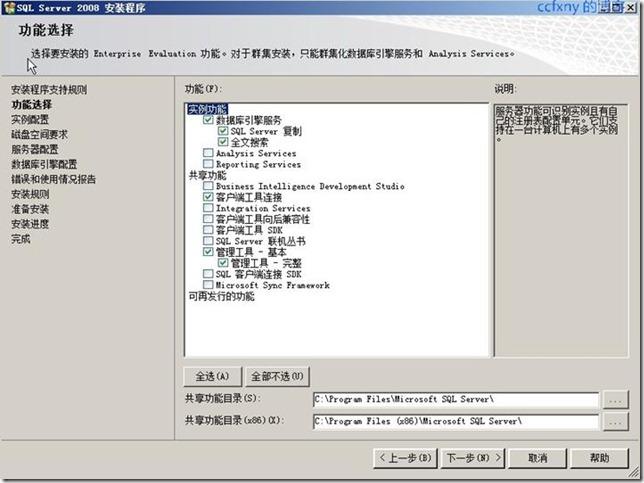 在弹出的【功能选择】对话框中选择要安装的功能并选择【共享功能目录】,点击下一步。