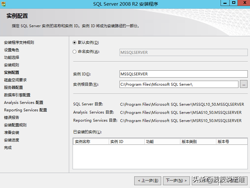 点击下一步,出现【实例配置】对话框。制定SQL Server实例的名称和实例ID。实例ID将成为安装路径的一部分。这里选择默认实例。