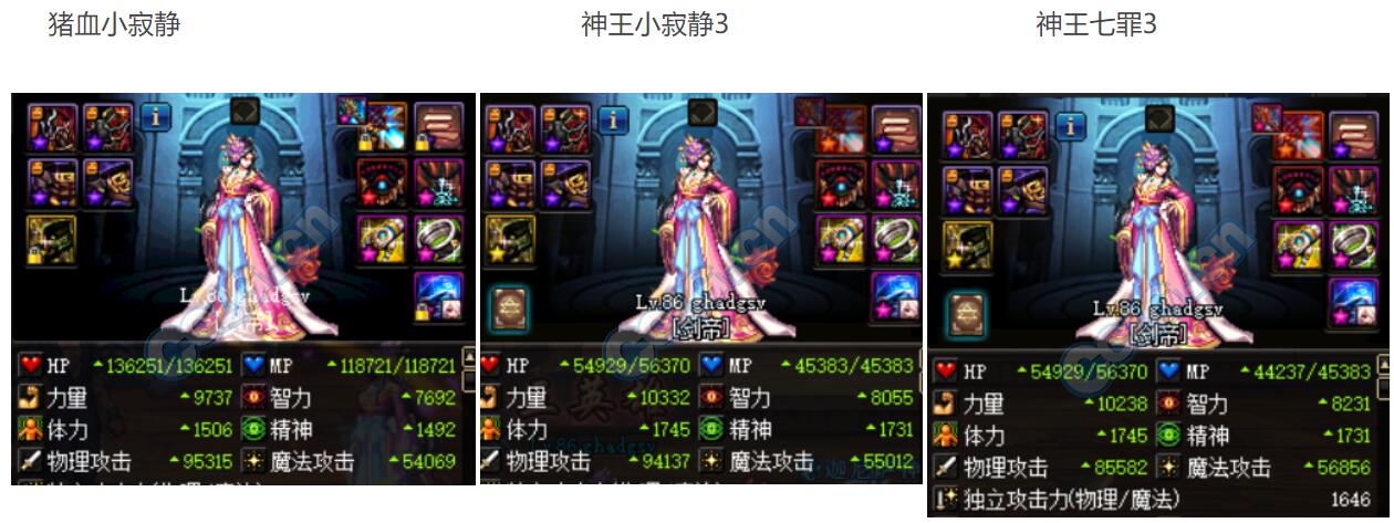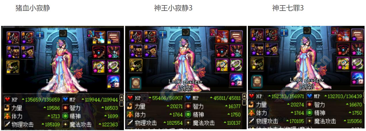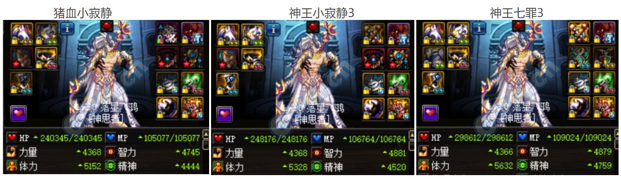 对比非常明了了,在不触发机师本体装备下,百分比对比应该是猪血小寂静>神王小寂静>神王七罪3,但是猪血小寂静和神王小寂静的面板非常接近!而主属性来说则正好相反: 神王七罪3> 神王小寂静>猪血小寂静 ,但是神王七罪3和神王小寂静的主属性面板非常接近!