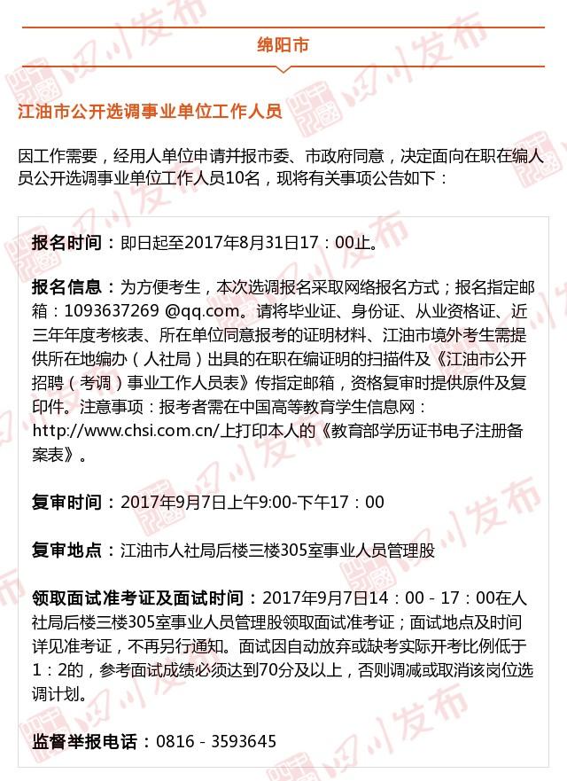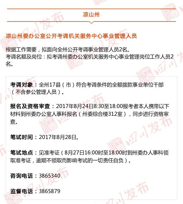 小伙伴们注意啦,2017下半年四川省公务员招录考试公告陆续公布,从8月17日起至8月22日,考生可登录四川人事考试网(www.scpta.gov. cn)报名。除此之外,今天川叔又为大家整理了一批最新的事业单位招考信息,涉及自贡、绵阳、内江、乐山、巴中、凉山等市州的相关事业单位,海量岗位不要错过,快点看看有没有你需要的。记得分享给身边需要的小伙伴哦!