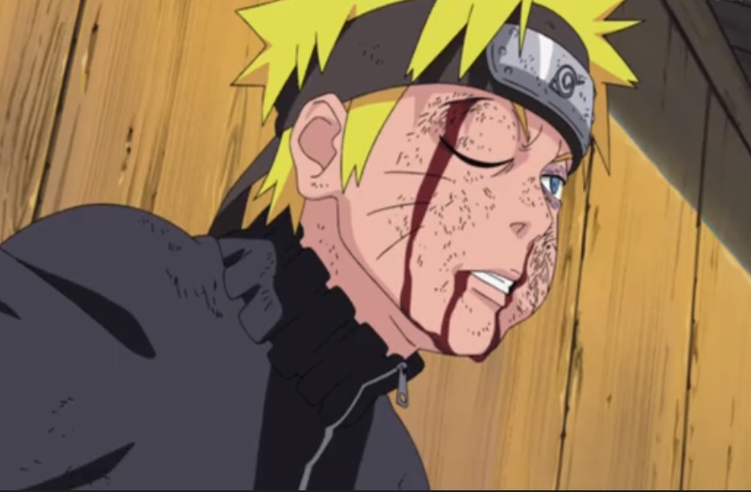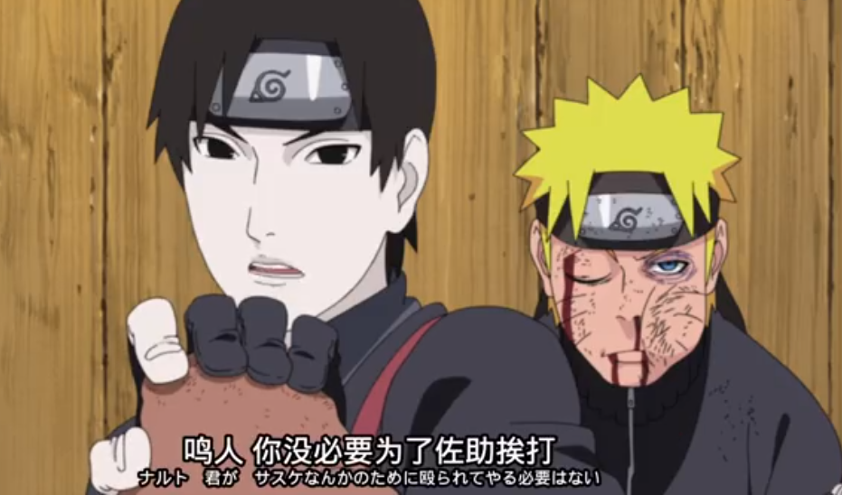 卡鲁伊等云隐村来到木叶兴师问罪,恰巧碰到了鸣人。鸣人了解情况后,既不敢相信这个事实,更不愿意出卖朋友,并表示愿意独自一人承担他们所有的怨恨和痛苦。卡鲁伊问不出情报,被鸣人固执偏袒佐助的行为气愤难耐,所以一拳又一拳地砸向鸣人。