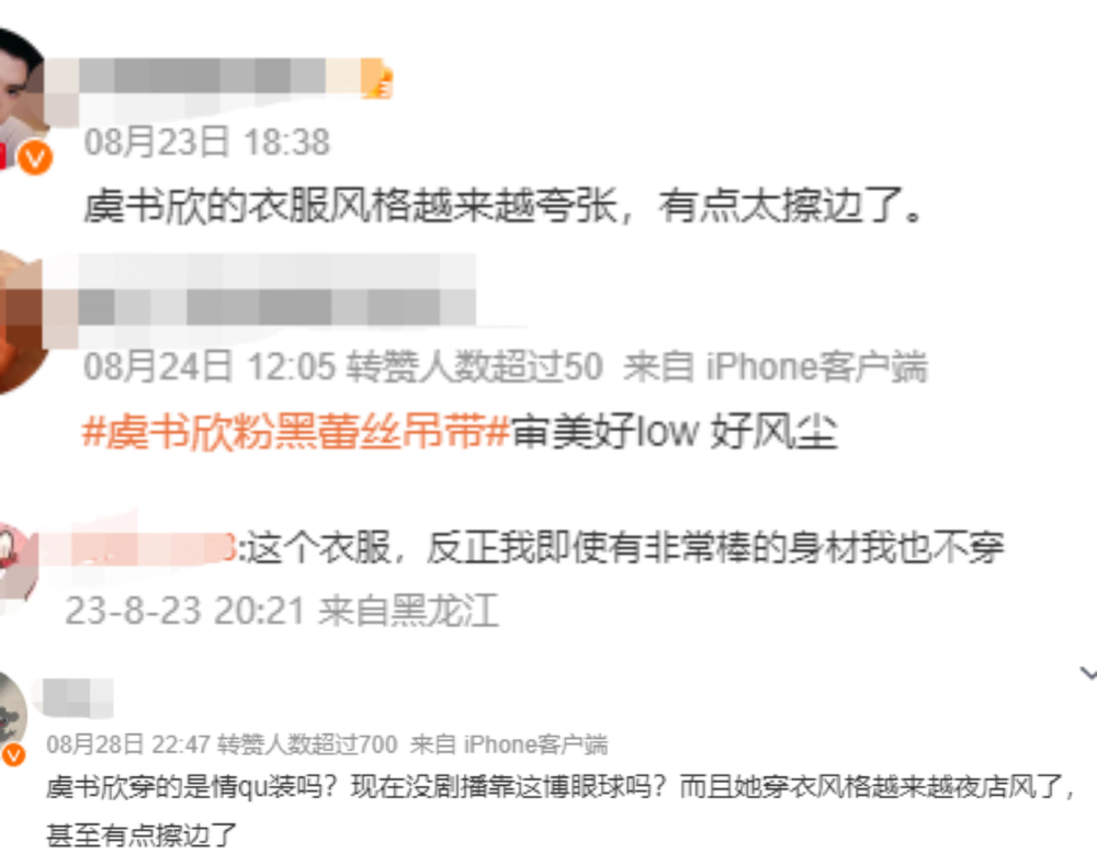被赤裸挂在热搜上讨论还有像 #娜扎露内裤带、#迪丽热巴又漏背了、#热依扎露胸、#杨幂露内衣肩带;近期虞书欣穿低胸蕾丝裙的造型,也收到不少审美low、风尘、擦边女的恶评。