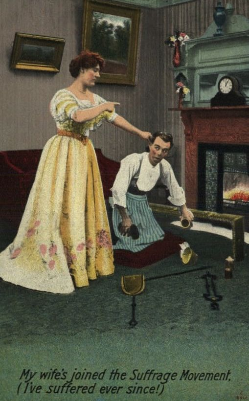 1890 年代和 1900 年代初的反妇女选举权海报,暗示一旦女性拥有选举权,会会导致男子气概的丧失