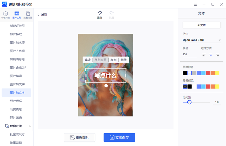 支持自定义选择字体、对齐方式、字体颜色、背景颜色等操作,添加好文字后还可以调整文字的大小,位置,完成后可以直接点击立即保存就可以下载图片了,