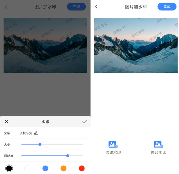 如果是添加文字水印的话,点击下面会进入文字变价页面,点击下方的编辑按钮,输入文字内容,还支持修改字体、颜色、水印大小、透明度等设置,输入完成后点击对号,最后点击完成就可以添加完成了。