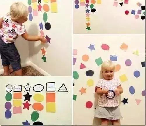 在墙上画好各种形状,然后让孩子分类粘贴。