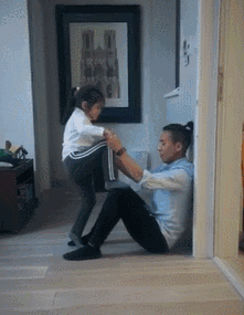 请先坐在地上伸直双脚,然后孩子跳过你的脚。 孩子跳过去之后,将腰部抬高,让孩子从腰部底下钻过去。