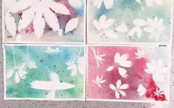 在白纸上放上树叶,再用颜料喷瓶进行喷画,等拿开树叶的那一瞬间,孩子们一定会大吃一惊哦!