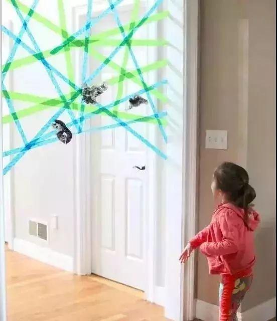 把胶带贴在墙上成为激光线,让孩子穿越不要碰到哦,是不是又紧张刺激的感觉。