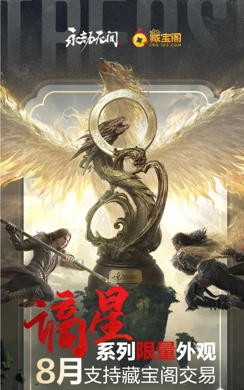 《永劫无间》将在 8 月开启藏宝阁 ,谪星系列外观可进行玩家间交易,是否解封、星格的数量将影响外观的价格。