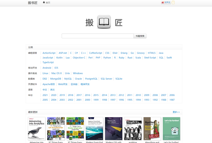 这是一个免费的计算机电子书籍下载网站,包括:编程语言、移动开发、操作系统、数据库、开源软件,基本上涵盖了市面上所有优质的计算机电子书籍,比较适合计算机学习爱好者。