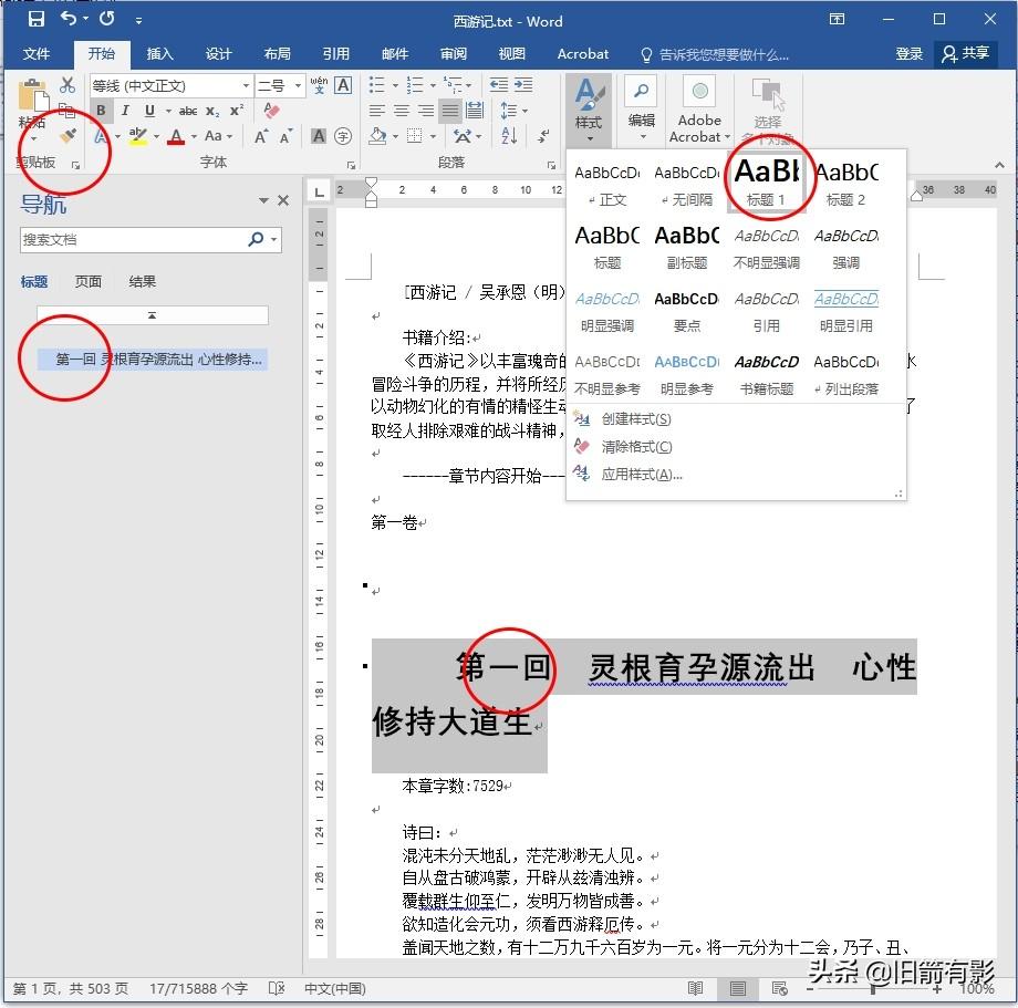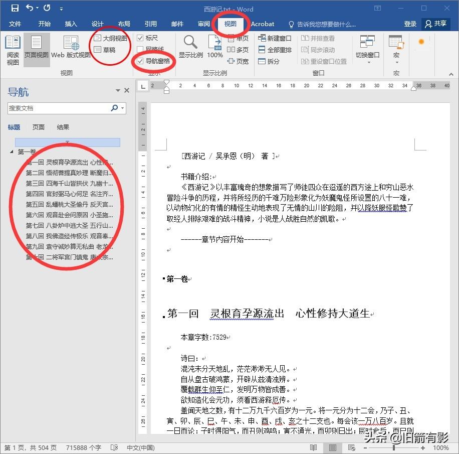 原始txt纯文本中每一章节标题也只是正文格式,可以使用“格式刷”将章节标题转换为“标题1”,即第一级目录,在word2016版中,不必要进入大纲视图,在“视图”中打开“导航窗格”就能看到标题的级别。