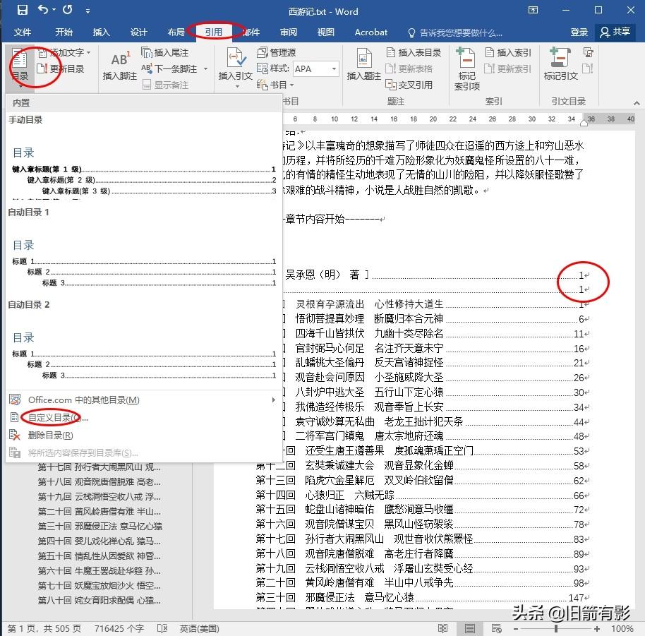 ▲“引用”选项卡中“目录”(电子书一般不需要页码,自定义设置去掉即可)