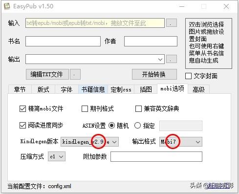 “mobi选项”,可以在easypub软件安装根目录下的“bin”文件夹中添加“kindlegen”新版本软件,目前的最新版为2.9,输出格式可以根据需要选择mobi7(可以通过邮件发送kindle设备)或KF8(只能通过usb在电脑端传输至kindle,可以显示更多的电子书排版设置),但是只能选择一种,这也就是后来我放弃使用EasyPub的一个主要原因。