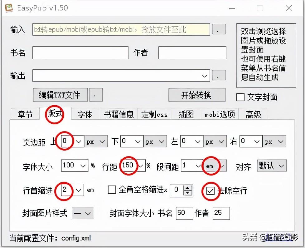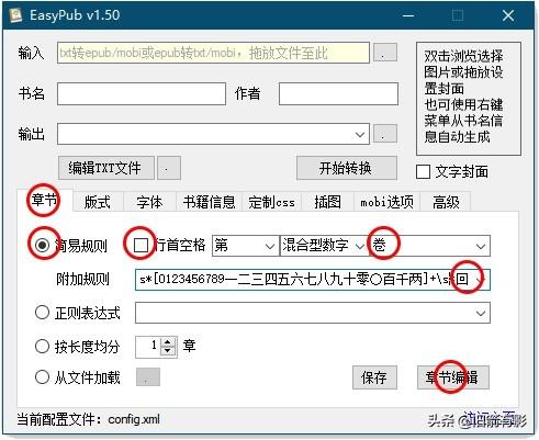 这个软件的精华在于设置相应参数,书名/作者/封面/输出地址/书籍信息不在这儿赘述,在软件ui界面按文件的情况或者自己的喜好填写即可。
