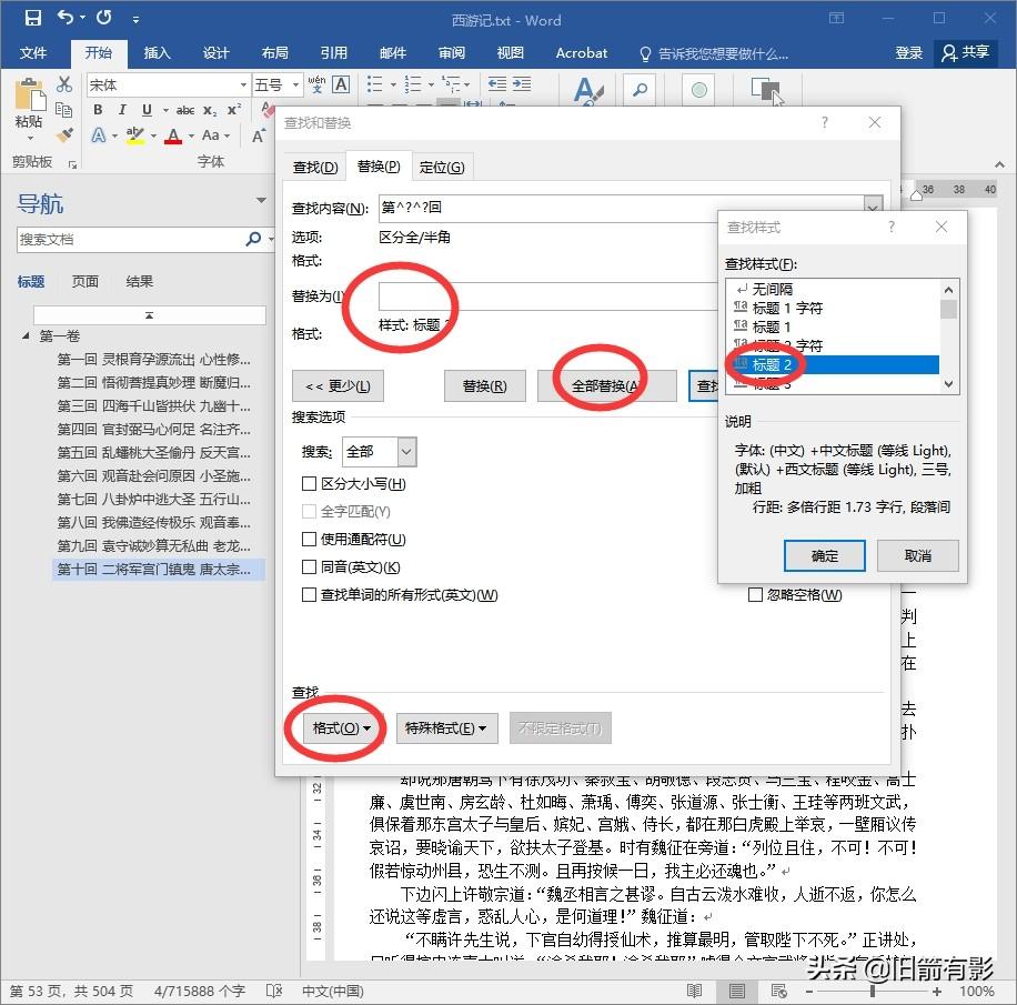 这时候word的“替换”强大之处就体现出来,word中“替换”是可以更改文字所在段落样式的,而查找中可以使用通配符,例如“第几回”用“第^?回”来表示(^?代指一个任意字符,如果是“第十几回”,属于两个字符,应该使用“第^?^?回”,章节数多可以多查找替换几次,最多的“第一千一百一十一回”,也不过7个字符,这种操作看似笨拙,却能在查找替换的同时进行校对,一些错误的标题很容易检查出来)。