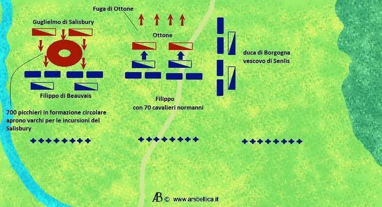 此时,已经搞定弗兰德斯人的法军右翼开始迂回,从侧翼猛击已经失去秩序的联军本阵。 他们很快发现了奥托本人,并在冲锋中用骑枪将他的坐骑眼睛刺瞎。堂堂皇帝因此坠马,靠着4名勇武侍从的力战才没有被对手抓获。但他非常害怕自己在混战中遭遇不测,因此在换上新马后就头也不回的本离战场。