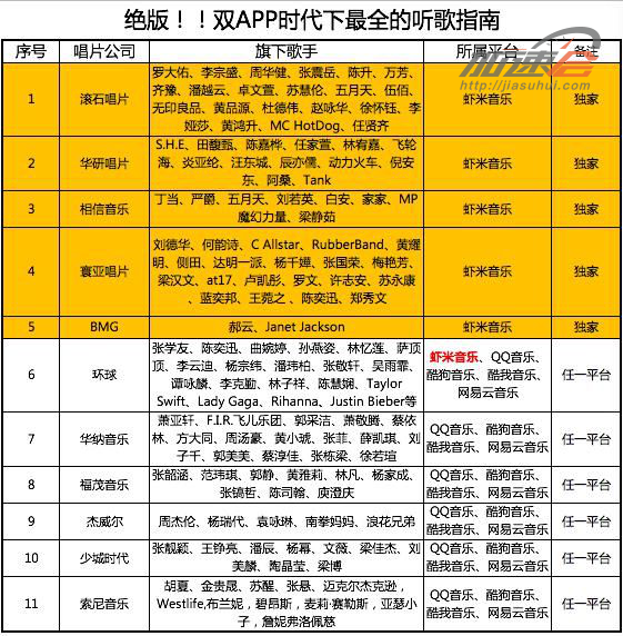 有人说这是一个正版音乐APP的时代,也是最能考量乐迷的专业音乐素养的时候。如果在这个阶段你对基本的音乐版权状况不了解,很有可能会影响到你是否能在第一时间听到你想听的歌。那么小编在这给你个建议参考: