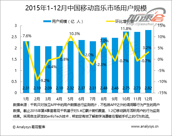 截止2015年12月,中国移动音乐市场用户规模达全年峰值2.82亿。《关于责令网络音乐服务商停止未经授权传播音乐的通知》要求网络音乐服务商在7月31日之前下架未经授权传播音乐作品,各大平台纷纷下架盗版曲库使得大量用户流失,经历版权洗牌的中国移动音乐市场用户规模在7月份环比下降2.3%。