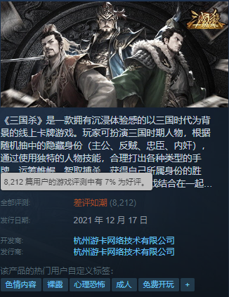 《三国杀》真是一款可以封神的游戏,这款游戏刚一上线Steam就立刻引来了大量的差评,从它推出Steam版本到现在一共也就一个星期,好评率已经仅剩下7%了。