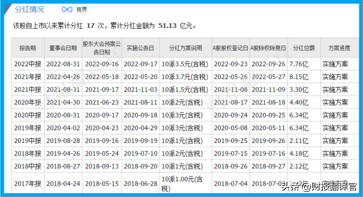 而从董秘的口中翻译官还得知,公司自上市以来累计分红17次,总共派发现金51.13亿元。并在2017-2022年期间,为股东分了14次红,分红占净利润的平均比重超过了30%。