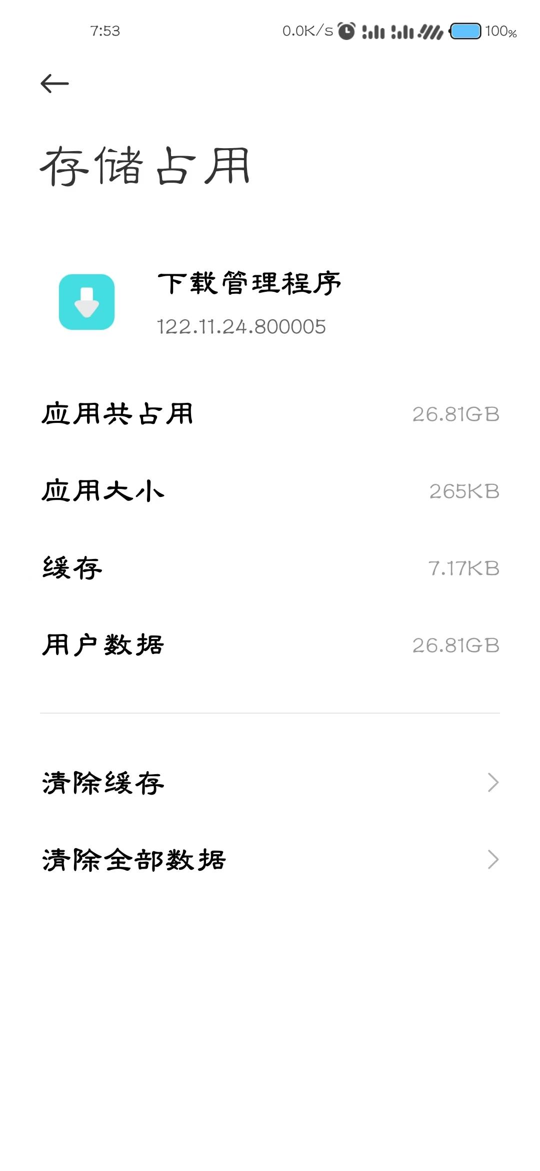 刚刚查看了一下容量占用情况。居然发现一个小小的[摊手]下载管理,占用了26.8g[再见]的容量。