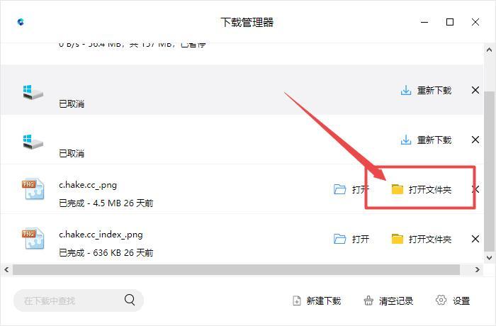 如何找到已下载完成的文件显示,我们可以点击在文件夹中打开进行查看文件,然后下载列表中每条记录右侧都有一个X按钮,点击后可以将下载列表中的记录删除。