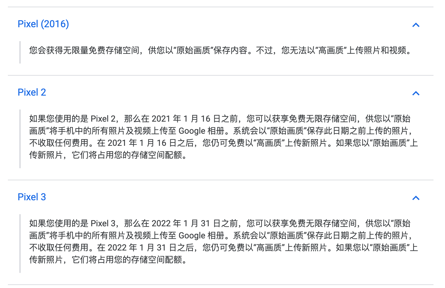 Google 还为 Pixle 手机的用户提供了额外的福利,使用 Pixel(1 代)上传原图可以享受无限存储空间,Pixel 2 和 3 的原图无限量空间,优惠期分别到 2021、2022 年截至。