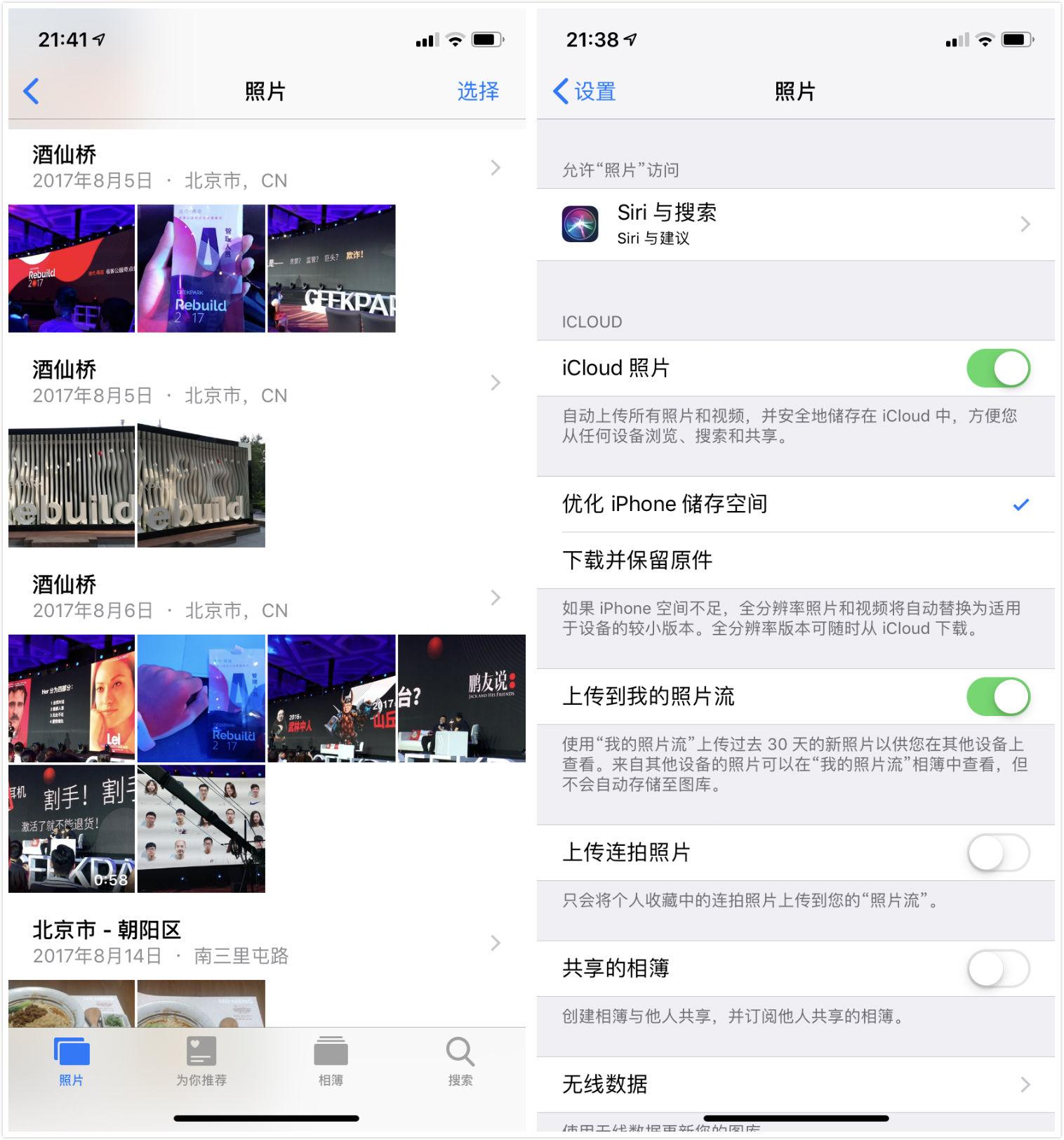 iPhone 的照片设置中有一个「优化空间」的开关,当本地空间不足时照片会自动压缩,原图备份在 iCloud 里。打开「照片流」的话,你的照片会同步到所有苹果设备上,方便查看。不过 iCloud 的同步规则是以设备为中心,云端只作为备份,在进行一些删除操作时逻辑会比较混乱。