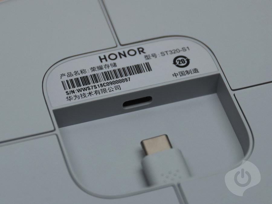 荣耀存储正面是哑光白色塑料,中间是大写“HONOR”刻字,刻字采用了光面质感。荣耀存储主体侧面一圈也是光面白色塑料,前部是LED指示灯,后部是USB Type-C供电线。