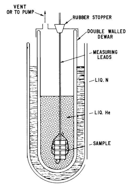 图6 一种用于低温实验的标准装置。它由两个杜瓦组成,外层的装有液氮,内部装有液氦。氦在大气压下的沸点是4.2K。通过对液氦减压,温度能够降低到1K左右。样品通过测量线路简单地悬挂在液氦中。