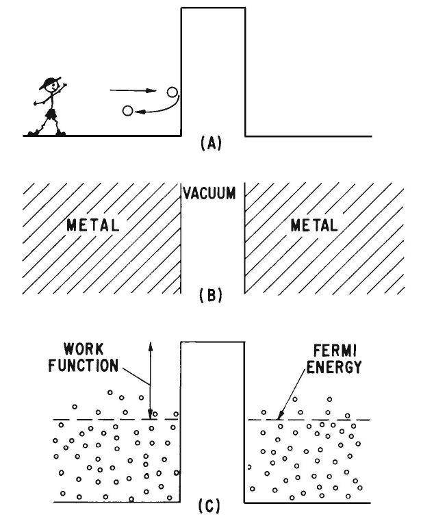 图1 A. 如果一个人把球扔到墙上,球会弹回来。物理定律允许球穿透或穿墙而过,但由于球是宏观物体,这种可能性微乎其微。B. 由真空隔开的两种金属类似于上述情况。金属中的电子是“球”,真空代表墙。C. 这两种金属的图示能量图。电子没有足够的能量逃到真空中。然而,这两种金属可以通过隧穿来交换电子。如果金属之间的距离很近,隧穿的可能性就很大,因为电子是一个微观粒子。