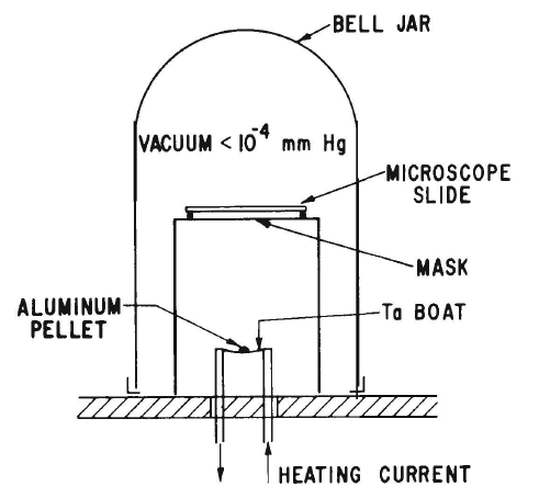 图2 用于沉积金属薄膜的真空系统示意图。如果在钽坩埚上利用电阻加热铝,铝将先熔化,再沸腾并蒸发。然后铝蒸气会在蒸气流中的冷衬底上凝固。最常见的衬底是普通的显微镜载玻片。利用金属掩模板的屏蔽作用,可以在载玻片上形成图案。