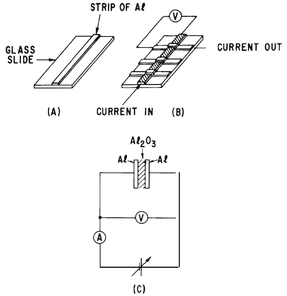 图3 A. 一个显微镜玻片,玻片中间有一层气相沉积的铝带。一旦铝膜暴露在空气中,表面就会形成一种保护性的氧化物绝缘层。氧化物的厚度取决于时间、温度和湿度等因素。B. 当氧化层形成后,在第一层膜上蒸镀一条与之交叉的铝带,使氧化层夹在两层金属膜之间。电流将沿着一层铝膜向上穿过氧化层,然后通过另一层铝膜流出,与此同时我们测量氧化层上的压降。C. 电路示意图。图中测量的是由两个铝薄膜和氧化层形成的电容式装置的伏安特性。当氧化层厚度小于50Å时,有明显的直流电流通过氧化层。