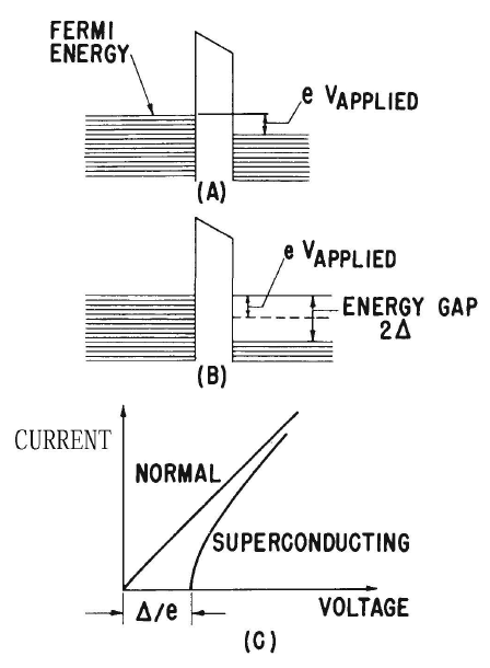 图5 A. 由势垒隔开的两种金属的能带图。由于两种金属间存在电势差,它们的费米能级是不同的。左侧金属中只有能量高于右侧金属最高能级的电子才能隧穿到右侧,因为只有这些电子所处的能级在右侧是空态。泡利原理使得在每个量子态中只能存在一个电子。B. 右侧金属现在处于超导态,因此在其能带中有一个超导能隙,能隙中不存在单电子的能态。左侧的电子仍然可以穿过势垒,但是如果外加电压给他们提供的能量小于超导能隙的一半的话,在右侧超导体中没有与其能量相符的态,因此他们将无法继续进入右侧。当外加电压给隧穿电子提供的能量大于超导能隙的一半时,才会出现电流。C. 伏安特性曲线示意图。当两种金属都处于正常态时,电流与电压成正比。当一种金属处于超导状态时,电流电压特性会发生很大变化。伏安特性曲线的确切形状取决于超导体中的电子能带。